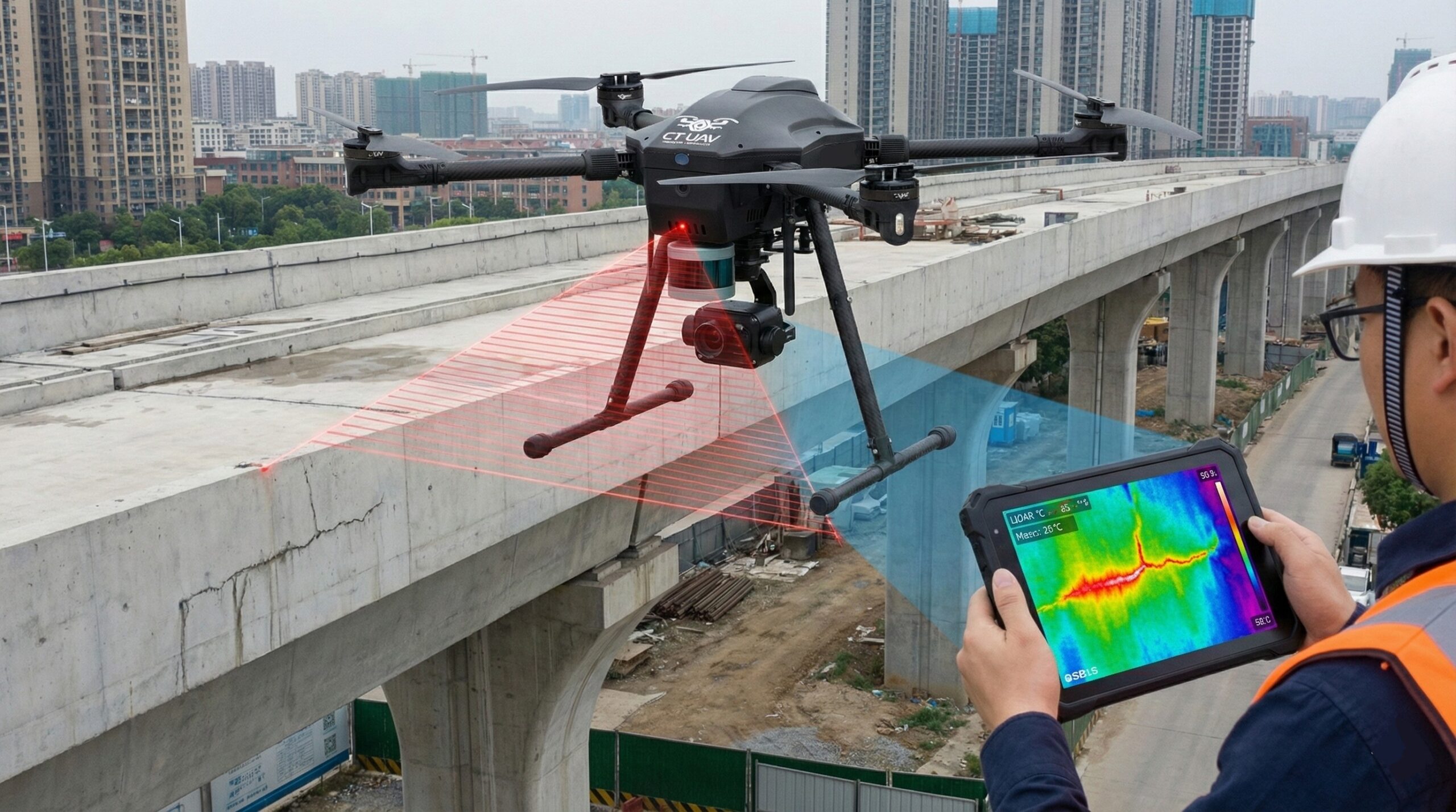Theo dõi cầu vượt, đường sắt trên cao bằng UAV LiDAR + nhiệt để phát hiện nứt và ăn mòn.